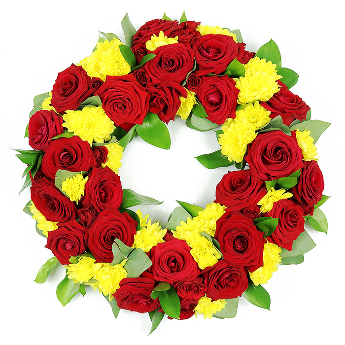 Express your sympathy with the Heartfelt Condolences Wreath from Flowers Dartmouth Park. This elegant funeral wreath symbolises the circle of eternal life, offering a beautiful way to honour a loved one whose spirit will always be remembered. Expertly handcrafted by our skilled florists in Dartmouth Park, this tribute features rich red roses, vibrant yellow chrysanthemums and fresh greenery, creating a lush, full arrangement with striking colour contrast.