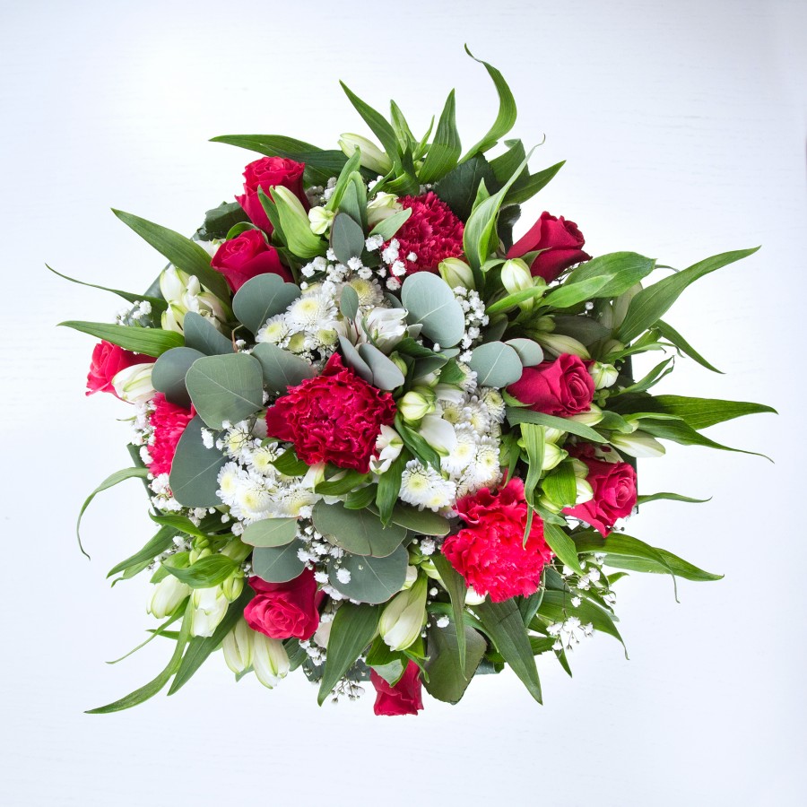 Celebrate the vibrancy and freshness of spring with our Vibrant Spring Floral Arrangement. This exquisite bouquet features bright red roses, sweet white chrysanthemums, and delicate gypsophila, all artfully combined with carnations and white alstroemeria.